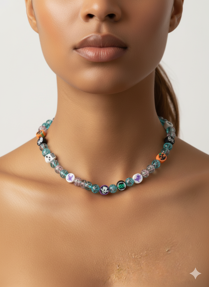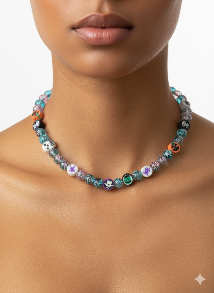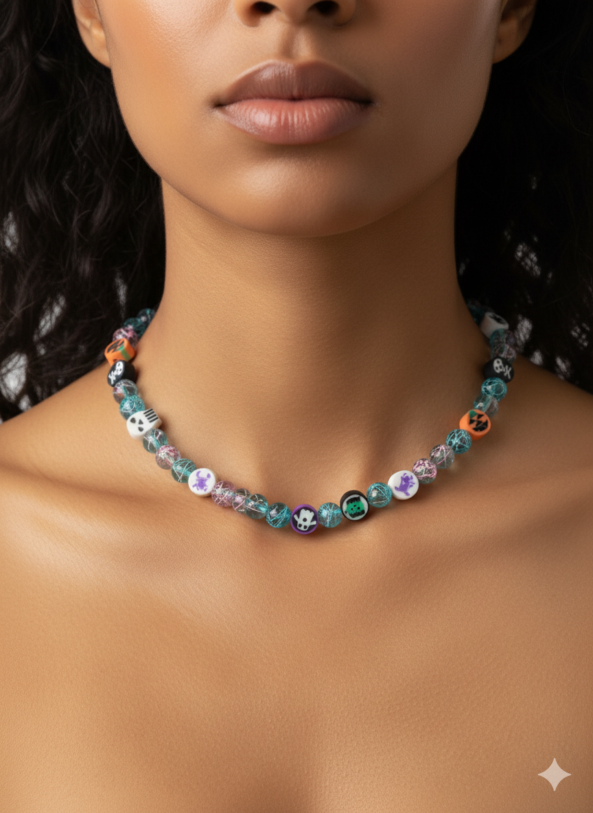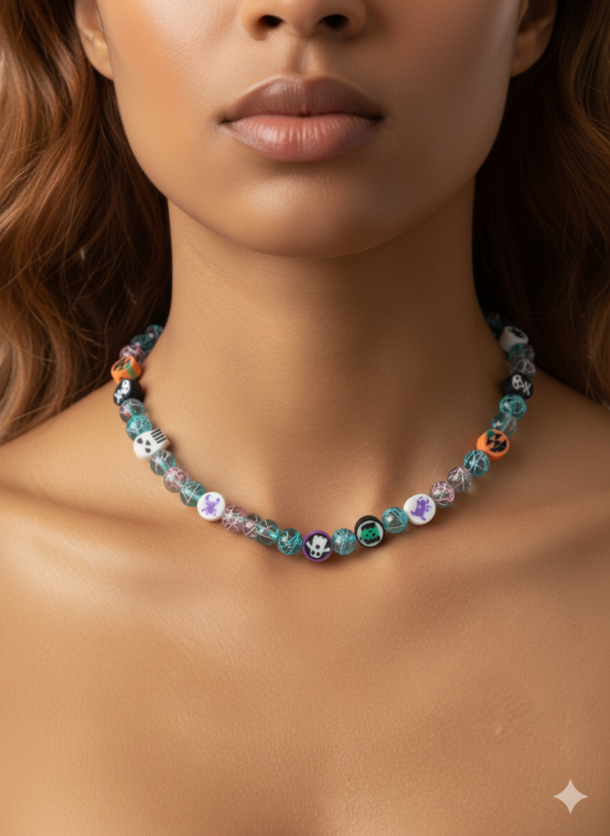 Turkuaz, pembe ve mor tonlarında renkli akrilik boncuklarla süslenmiş el yapımı Cadılar Bayramı kolyesi. Hayaletler, balkabakları ve kafatasları gibi eğlenceli ve ürkütücü takılarla süslenmiş bu eğlenceli ama bir o kadar da sıra dışı parça, Cadılar Bayramı sezonu için mükemmel. Hafif, modaya uygun ve partiler, kostümler veya hediyeler için iddialı bir kolye olarak ideal.