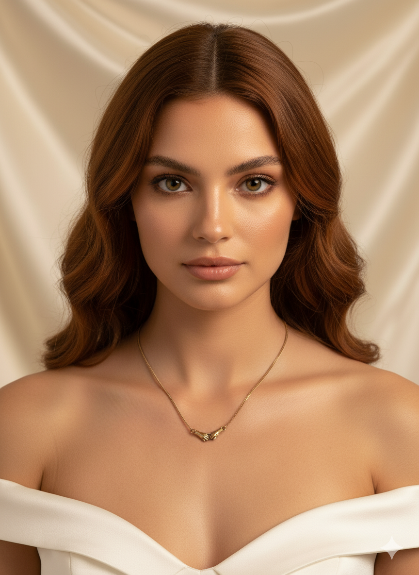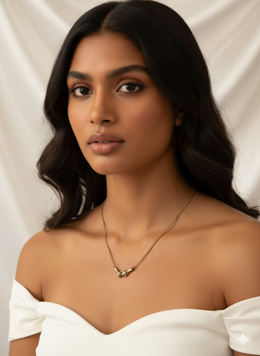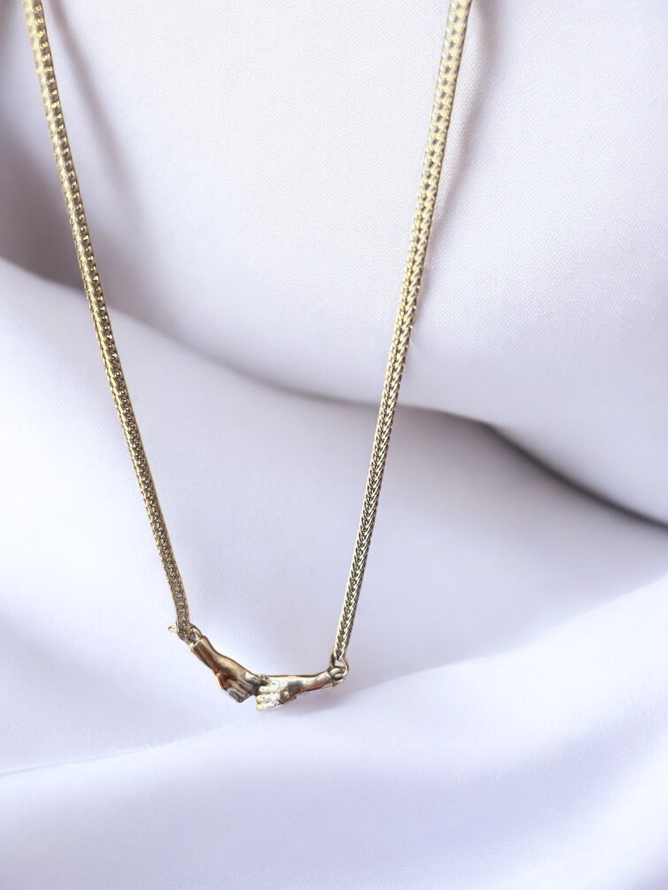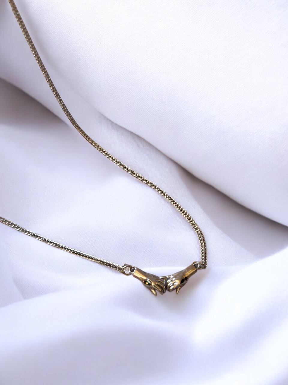 El yapımı altın kolye, iki elin birbirine kenetlendiği benzersiz bir kolye ucuna sahiptir. Sevgiyi, birliği ve bağlantıyı simgeleyen bu kolye, vintage esintili tasarımı modern minimalizmle birleştiriyor. Günlük kullanım, üst üste takma veya sembolik mücevherlere değer veren kadınlar için anlamlı bir hediye olarak mükemmel.