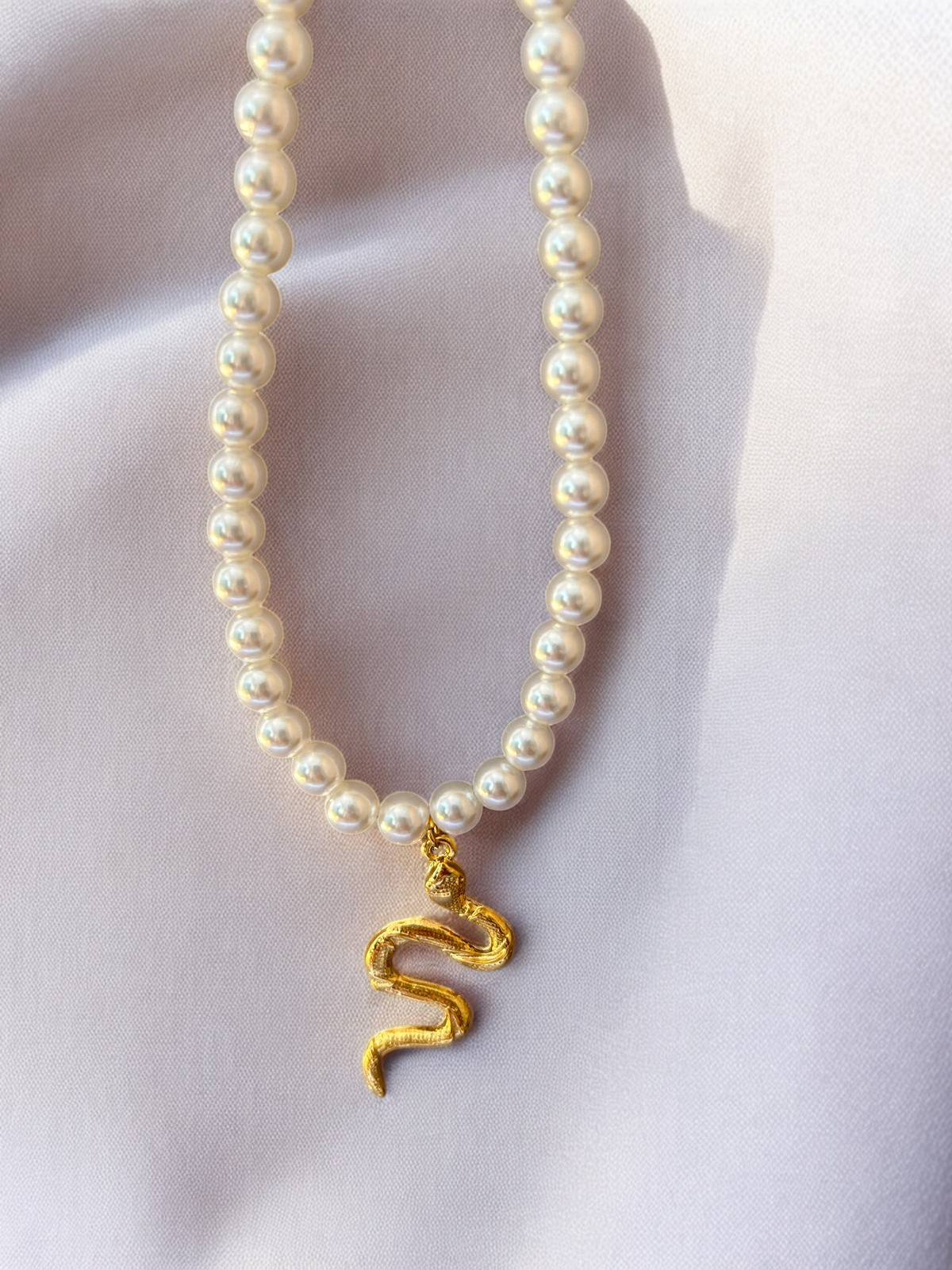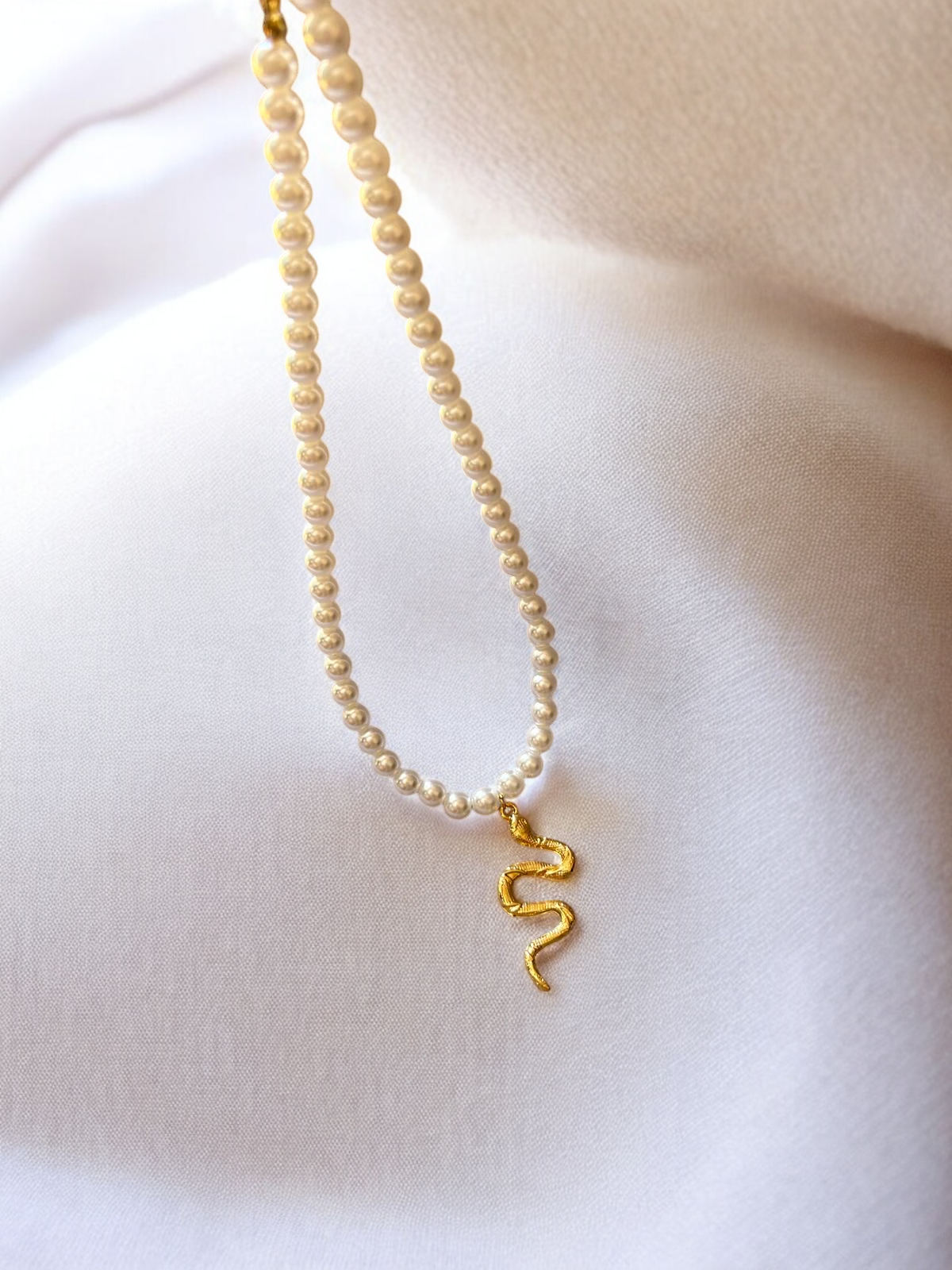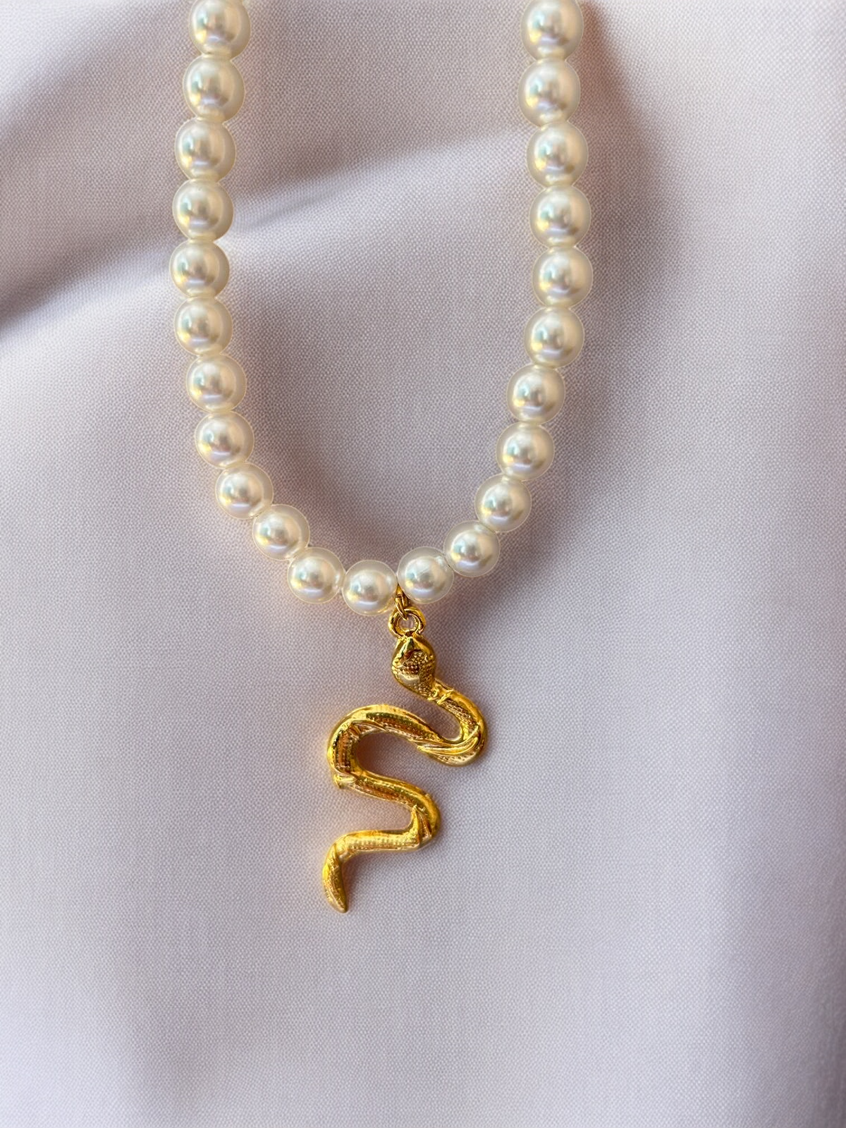 Altın Yılan Uçlu İnci Kolye | Kadın Gotik Takı