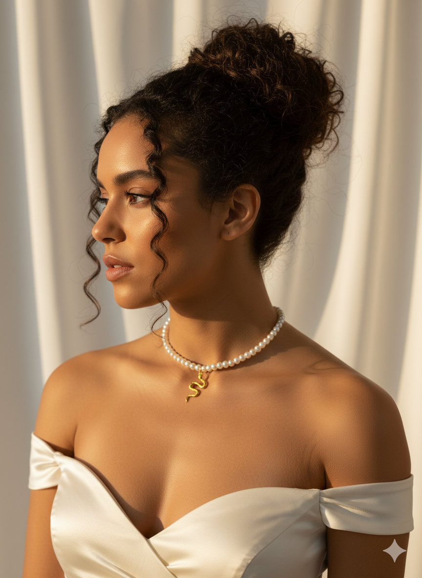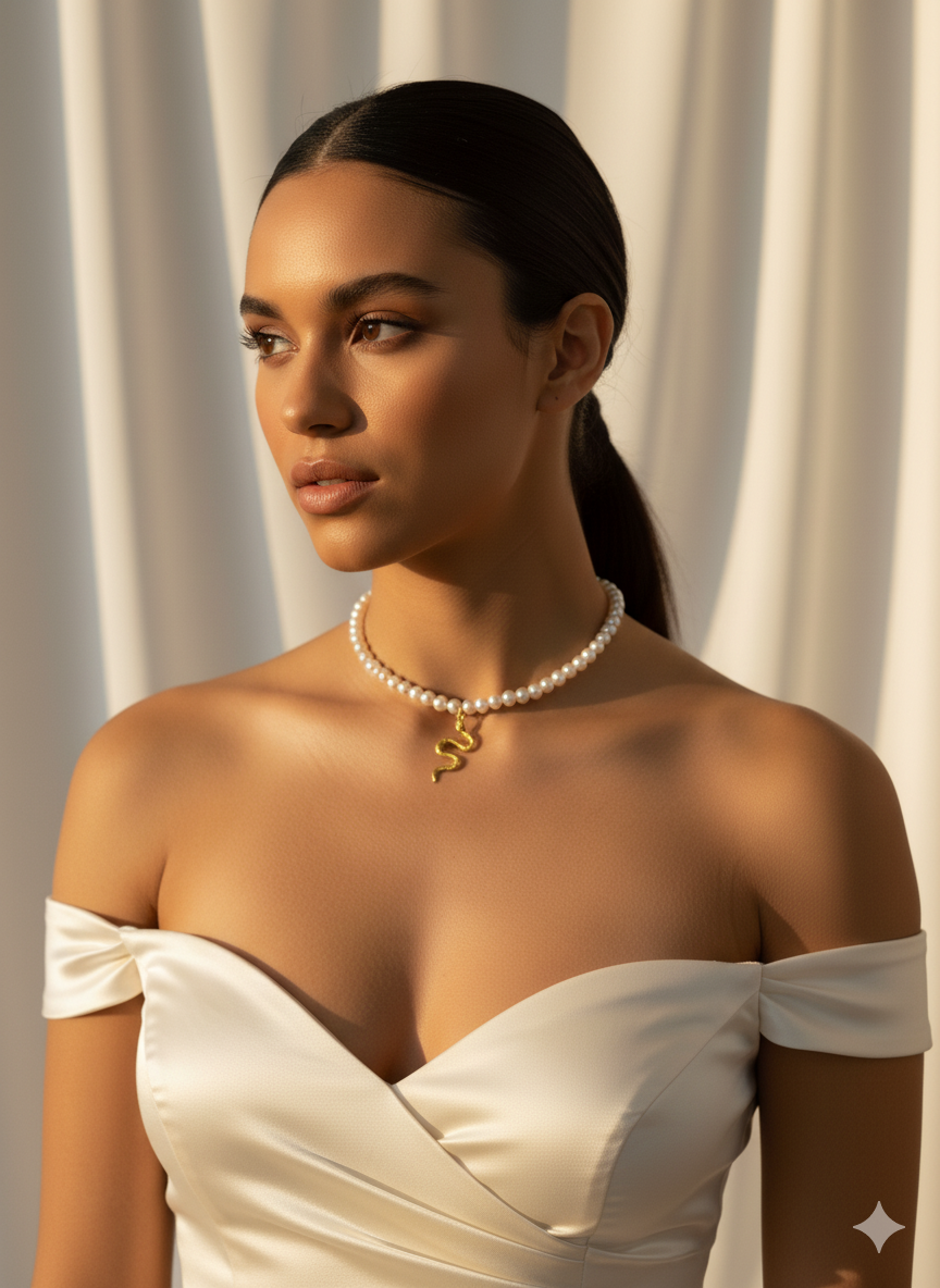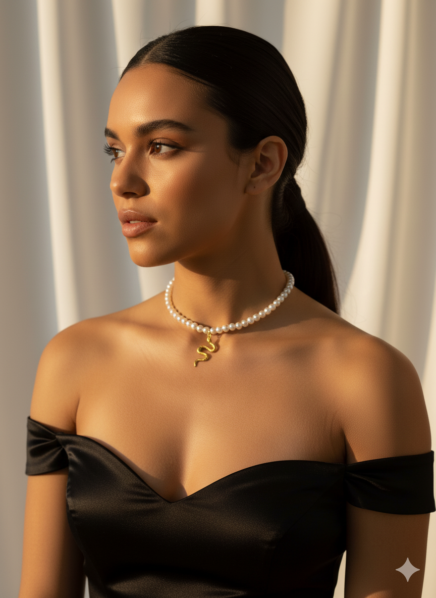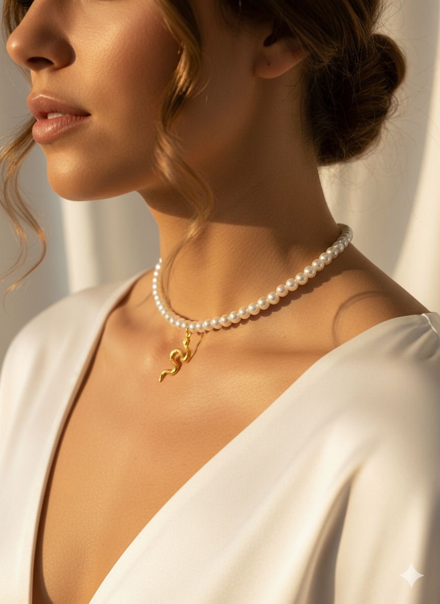 Yuvarlak beyaz inciler ve cesur bir altın yılan kolye ucuyla süslenmiş el yapımı inci gerdanlık kolyenin yakın çekimi. Tasarım, klasik inci zarafetini cesur yılan sembolizmiyle birleştirerek benzersiz bir vurgu parçası yaratıyor. Gotik moda tutkunları, bohem stil tutkunları veya cesur takıları seven kadınlar için anlamlı bir hediye olarak mükemmel. Konfor ve katmanlama için ayarlanabilir uzunluk.