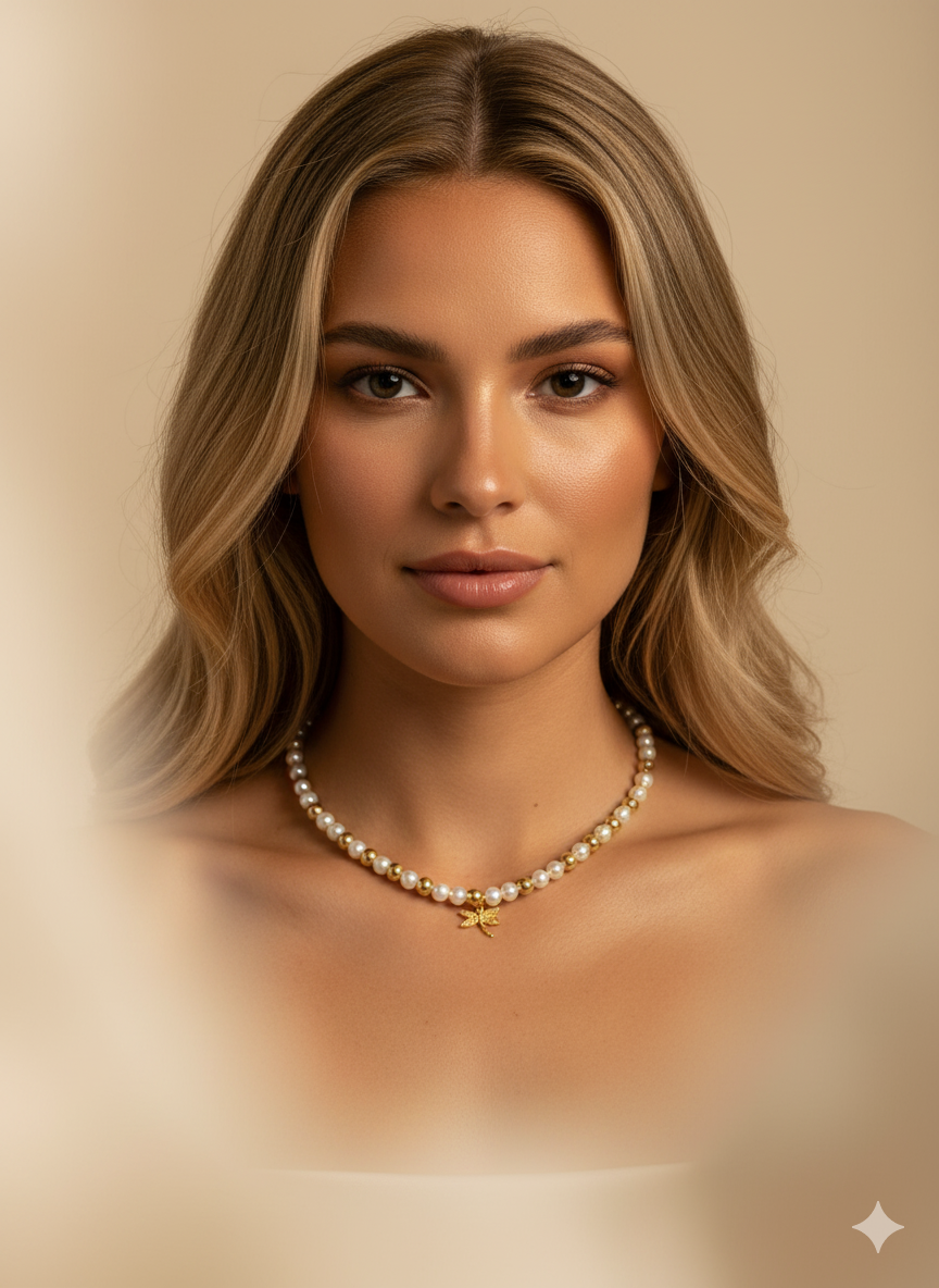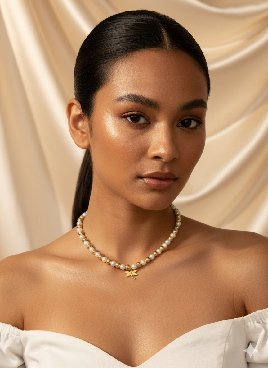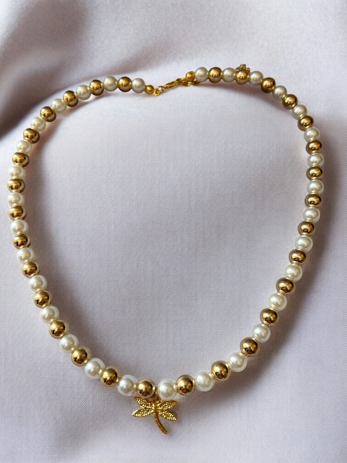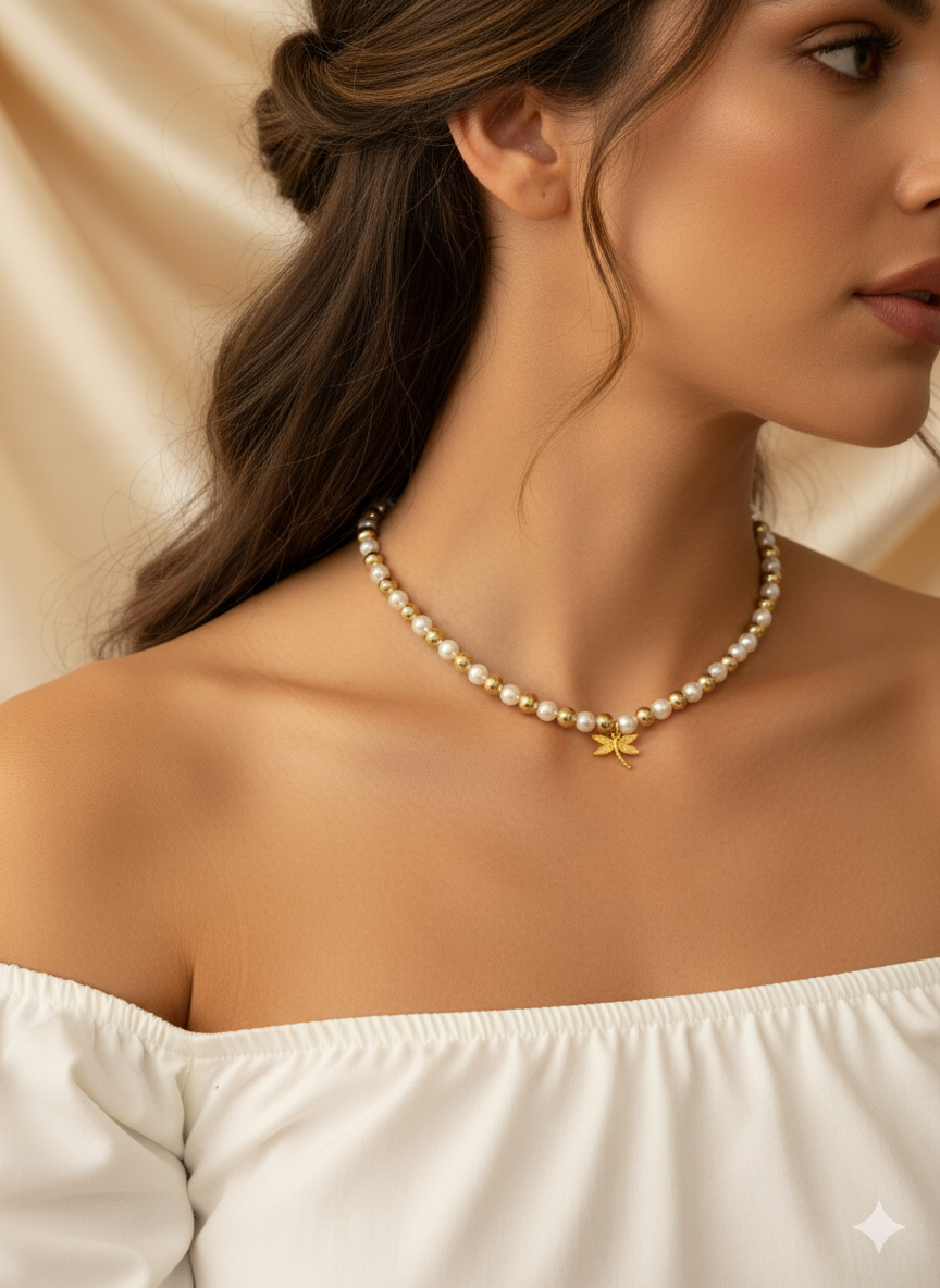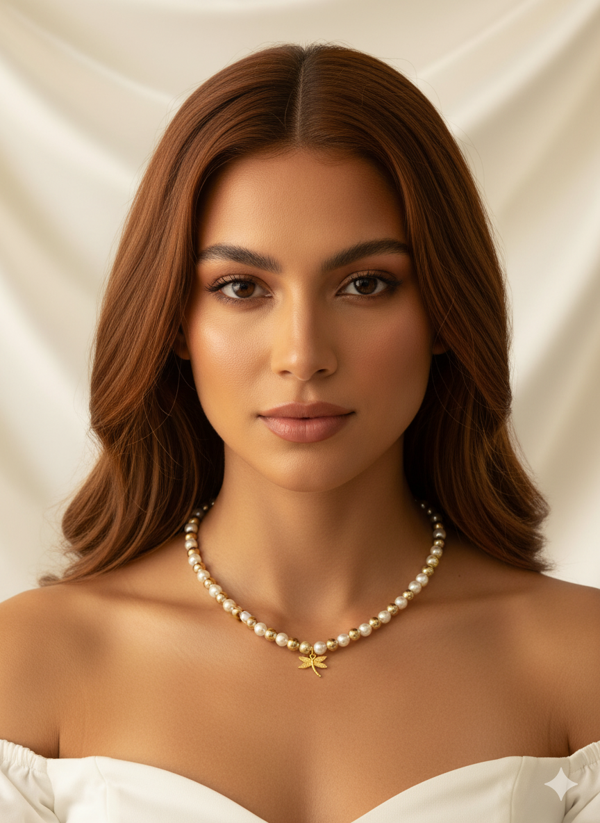 El yapımı inci ve altın boncuklu kolye, detaylı altın yusufçuk kolye ucuyla tamamlanıyor. Işıltılı inciler ve cilalı altın boncukların birleşimi, zamansız ama doğadan ilham alan bir görünüm yaratıyor. Gösterişli bir kolye olarak, üst üste takmak için veya sembolik takıları seven kadınlar için anlamlı bir hediye olarak mükemmel