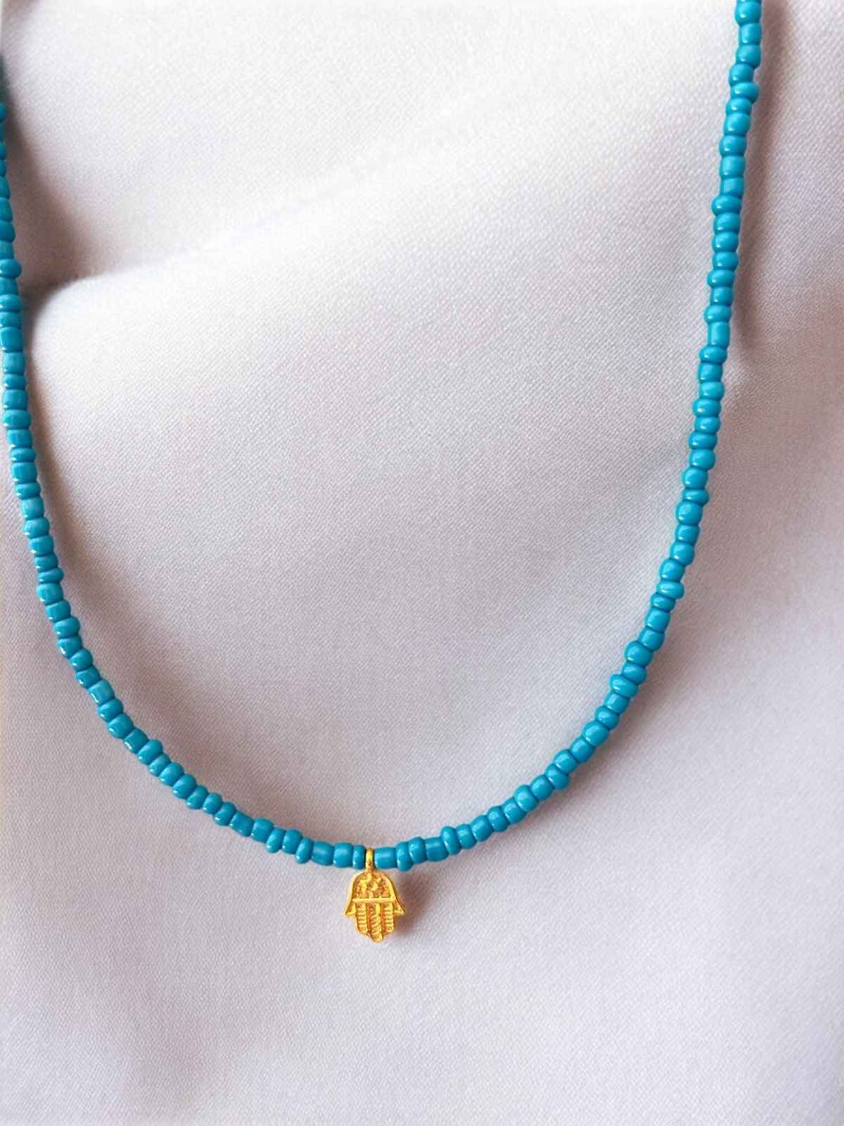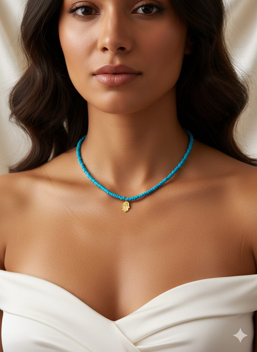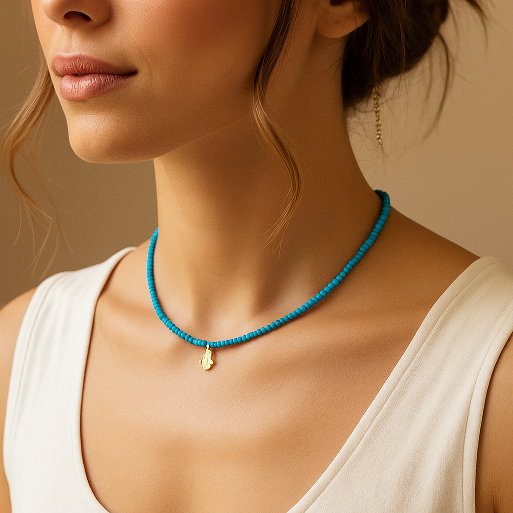 Turkuaz Boncuklu Altın Hamsa Eli Kolye – Kadın Takı